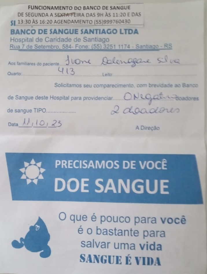 Santiago – Familiares e amigos da dona Ivone Dalenogare Silva (56 anos), fazem um apelo urgente por doações de sangue do tipo O negativo, que é considerado raro e de difícil obtenção. Atualmente, ela encontra-se no quarto 413 do GHS.