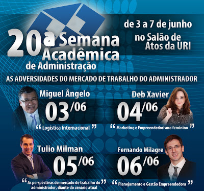 O curso de Administração da URI estará promovendo sua 20ª Semana Acadêmica de 03 a 07 de junho, com o tema “As Adversidades no Mercado de Trabalho do Administrador”. Serão abordados nas palestras os obstáculos e também as oportunidades para os profissionais desta área. Na programação constam os seguintes palestrantes: