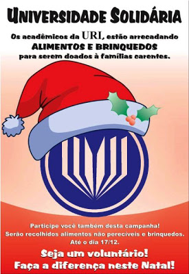 Neste sábado, 15 de dezembro, alunos e professores participam de mais uma caravana da solidariedade, com início às 14h, passando principalmente pelos bairros Céu Aberto, Lulu Genro, Riachuelo e São Jorge. Contribua com alimentos ou brinquedos que serão doados a famílias carentes. Também existem postos de coleta na universidade e no centro de estágios e práticas profissionais, no centro de santiago. Seja um voluntário. Faça a diferença neste Natal!