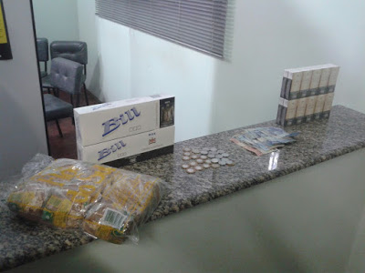 pacotes de cigarros, um fardo de fumo e dinheiro (valor não divulgado). Foi