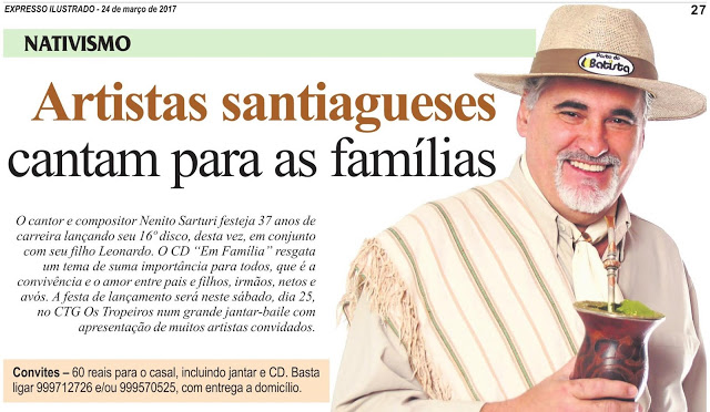 O jornal desta sexta (24) traz muitas notícias, dentre elas o lançamento do 16º disco do cantor e compositor Nenito Sarturi. O evento em comemoração aos 37 anos de carreira do santiaguense será neste sábado no CTG OS Tropeiros numa noite festiva com participação de vários artistas. Ainda restam alguns convites. O casal paga 60 reais (jantar e CD). Entrega a domicílio pelos fones 999712726 e 999570525.