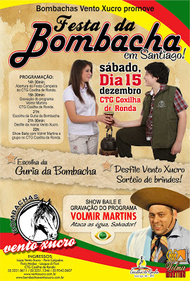 A marca Vento Xucro vai promover no dia 15 a grande Festa da Bombacha. Será no CTG Coxilha de Ronda, com diversas atrações. A começar pela gravação do programa Volmir Martins, da Band, que também promete animar a noite com seu grupo. Vai ter desfile da marca Vento Xucro e escolha da Guria da Bombacha. Os ingressos estão à venda na loja Vento Xucro, na Paris Modas, Paris Calçados e L’áqua Di Fiori, ao preço de 10 reais para sócios; 15 pra não-sócios e mesa a 80 reais.