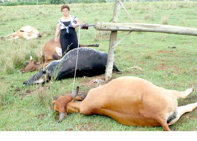 São Francisco – Na noite de quarta uma forte ventania derrubou postes de luz na estrada de acesso ao bairro Italiano com a RS 377 e causou prejuízos numa propriedade a dois km da cidade. Quatro vacas leiteiras que estavam prenhes, morreram ao ser atingidas pelos fios de alta tensão. Sônia Monteiro, arrendatária da propriedade, disse que não viu nada e só ficou sabendo pela manhã ao ser avisada por um vizinho. Ela espera ser ressarcida pela Aes Sul. (foto: Palmor Fotos).
