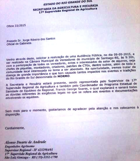 Em tempo: a assessoria do vereador Maci entrou em contato dizendo que ele tinha feito a proposta, mas retirou o pedido quando a própria secretaria estadual de Agricultura enviou o convite (foto abaixo) pedindo a presença de todos os vereadores, e também de patrões de CTGs, piquetes e criadores.