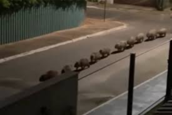 Um grupo de pelo menos 15 capivaras foi visto andando em fila indiana em uma rua residencial do Lago Sul, em Brasília, na noite da última quinta-feira (20).