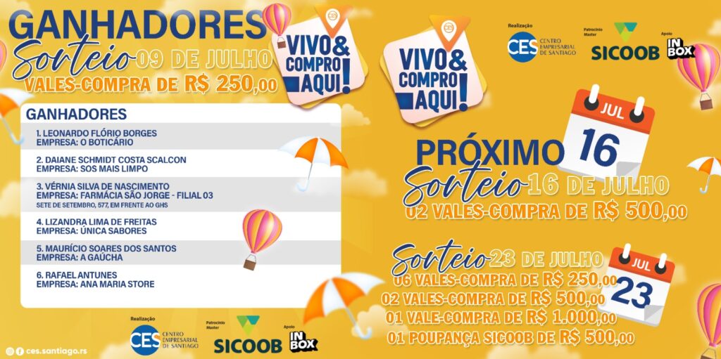 Santiago – Nesta terça (9/7), houve a segunda rodada de sorteios da campanha promovida pelo Centro Empresarial. Seis consumidores foram contemplados com vales-compras de 250 reais. Confira os ganhadores: