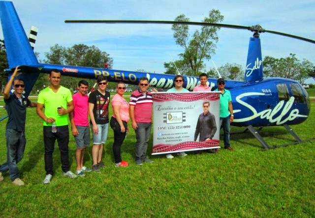Santiago– Quatro clientes da loja curtiram um passeio de helicóptero nesta semana, patrocinado pela empresa Sallo, fabricantes de camisetas e roupas masculinas. Os contemplados foram Vagner Silveira, Vinícius de Oliveira, Aldrin Pizzolato e Maurício Portes Gomes, que curtiram o visual de Santiago e região por um ângulo que poucos têm a oportunidade. A direção da Don Luigi agradece ao comando do 9º B Log, que permitiu que os pousos e decolagens fossem feitos no quartel.