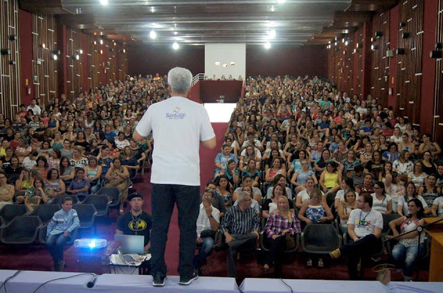 Santiago – Os professores municipais receberam as boas-vindas da secretária Mara Rebelo e do prefeito Tiago Gorski antes da palestra do escritor Eduardo Shinyashiki, que abordou o tema “Abrace sua missão: vença desafios e construa o futuro”. Mais de 500 lotaram o auditório do Colégio Medianeira na última sexta, 16 para a abertura do ano letivo na rede municipal.