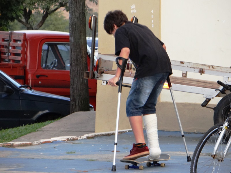 Santiago – O esporte é sempre maravilhoso, e qualquer modalidade pode causar danos físicos. Este jovem da foto, por exemplo: não se sabe onde foi o acidente, se foi praticando skatismo. o certo é que o gosto pelo esporte é tamanho que ele nem esperou sarar da perna e já voltou para as pistas.
