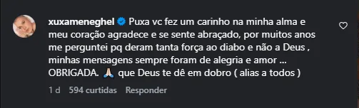 Xuxa agradeceu o apoio. Ela já foi alvo de críticas quando o gesto de “eu te amo” em Libras, foi interpretado por alguns como referência diabólica. Falou que nunca entendeu por que deram tanta força ao mal e não a Deus. Reforçou que seu trabalho sempre foi voltado ao público infantil, com foco em coisas boas.