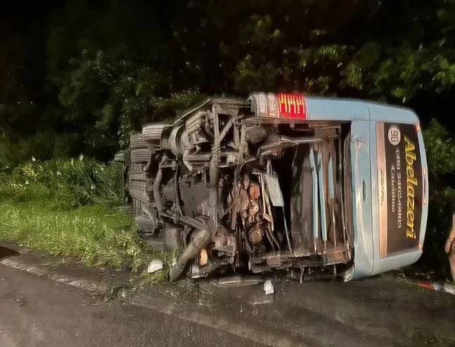 Guaratuba – Paraná – Um caminhão bateu na traseira de um ônibus na BR-376. O impacto fez o ônibus atingir outra carreta, colidir contra uma mureta e tombar na lateral da rodovia.