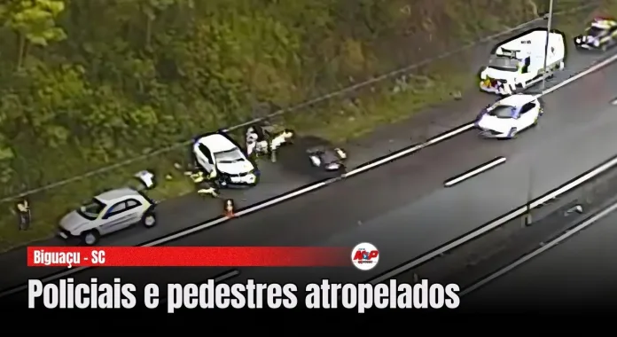 Biguaçu – SC – (Região de Florianópolis) – Quatro pessoas foram jogadas para o alto por um veículo escuro na tarde de quarta-feira, 24. O grupo estava no acostamento da rodovia para atender uma ocorrência anterior quando foi atingido. Entre os feridos estão dois policiais da Polícia Rodoviária e dois pedestres que recebiam auxílio no local.