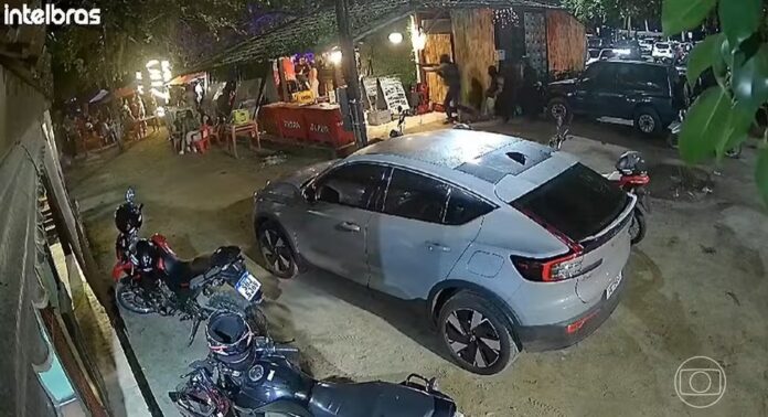 As imagens mostram os criminosos armados com fuzis, pessoas tentando se proteger e um policial civil de folga reagindo. Após o ataque, os atiradores fugiram em um carro branco.