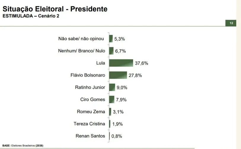 A diferença entre os dois, que passava de 17 pontos, agora caiu para menos de dez. Outros nomes como o prefeito do Paraná, Ratinho Junior, e o ex-ministro Ciro Gomes aparecem bem atrás, com menos de dois dígitos. A subida de Flávio consolidou o nome dele como o principal substituto do pai, que está fora da disputa por decisão da Justiça.