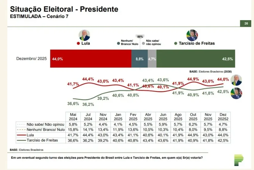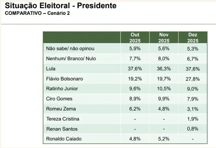 A pesquisa ouviu mais de duas mil pessoas em 163 municípios de todo o país entre os dias 18 e 22 de dezembro. Os números revelam que a polarização continua firme e que a escolha do “Zero Um” para a disputa deu um fôlego novo para a oposição. Enquanto isso, o governo Lula tenta manter a dianteira em um cenário que promete ser muito apertado na próxima eleição.