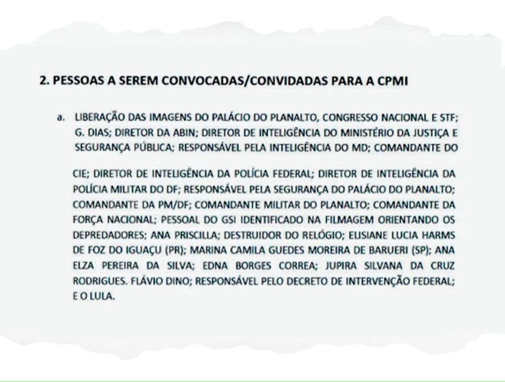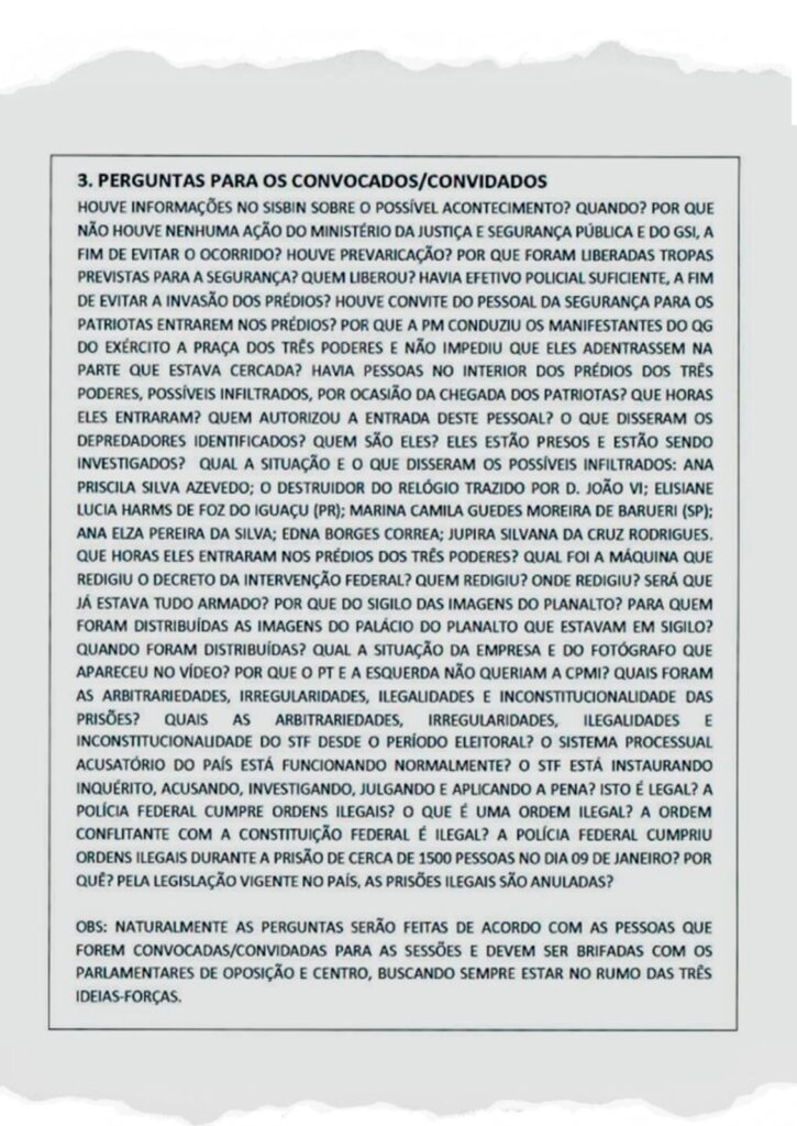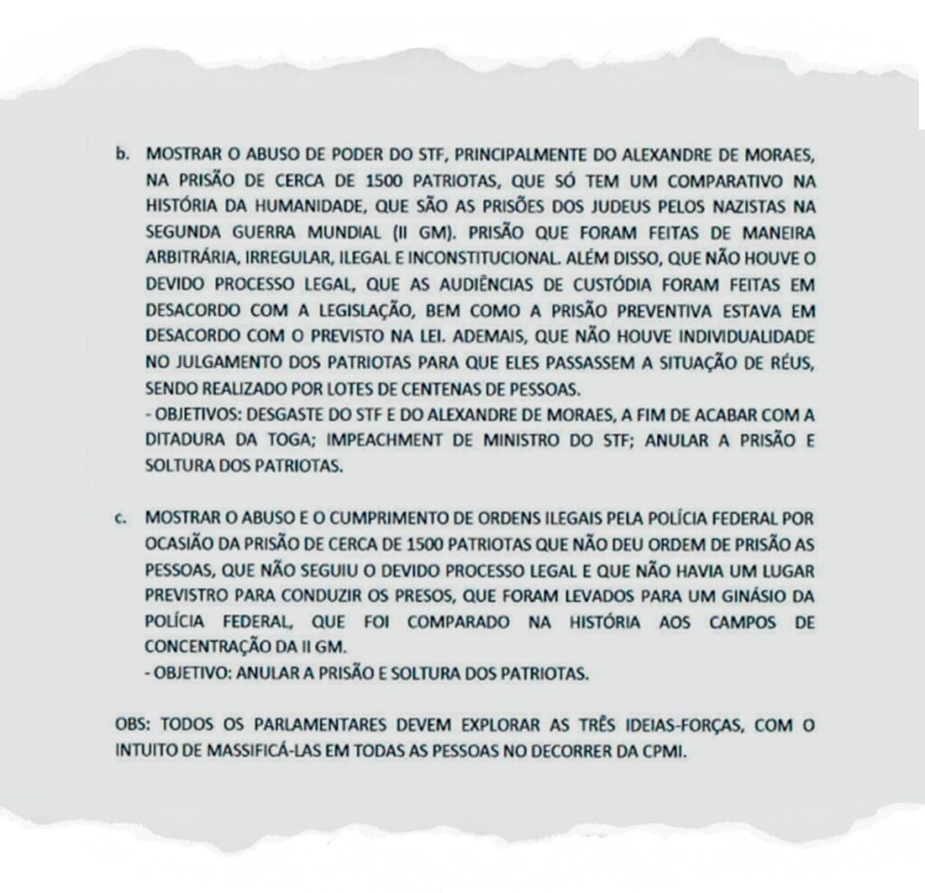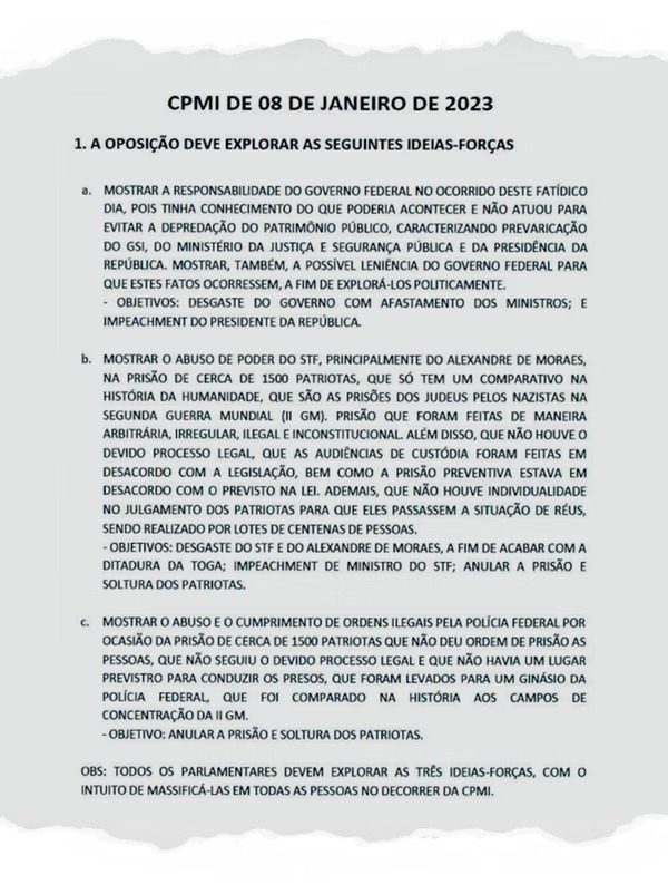 O roteiro, dividido em “ideias-forças”, indicava estratégias como responsabilizar o governo de Lula pelos atos golpistas e acusá-lo de leniência. As sugestões incluíam pedidos de impeachment de ministros e do presidente, além de alegações contra o Ministério da Justiça e o Gabinete de Segurança Institucional. A oposição deveria pressionar com a convocação de autoridades, como Flávio Dino e Gonçalves Dias.
