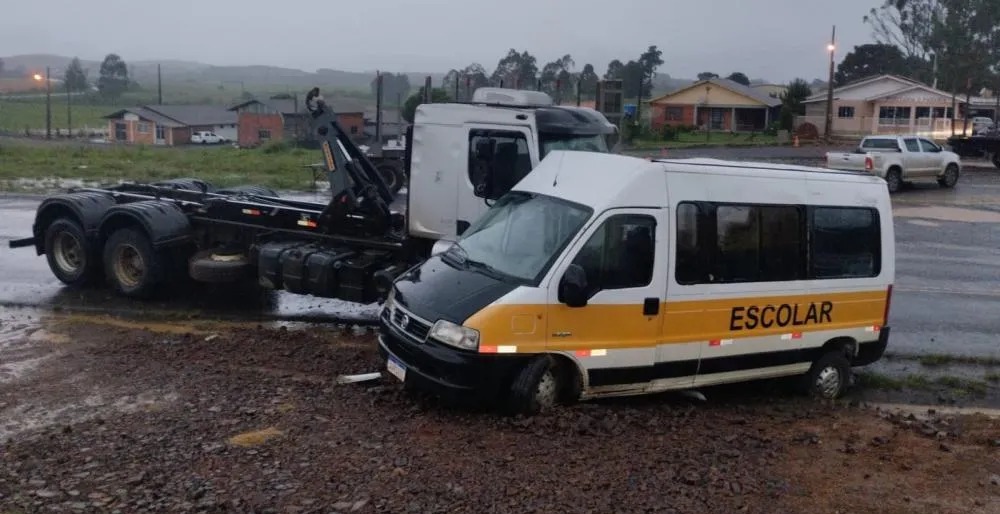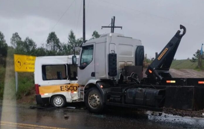 Salto Veloso – SC – Na tarde de quinta-feira, dia 24, Uma van escolar com 10 crianças colidiu com um caminhão Volvo na SC-150. O veículo retornava da escola quando ocorreu o acidente.