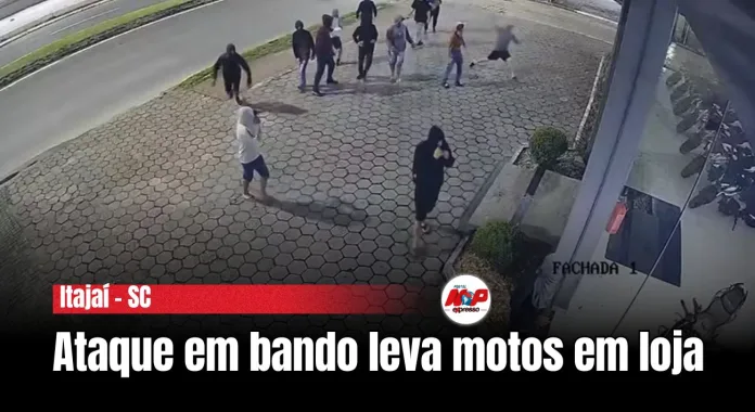 Itajaí – SC – (Litoral Norte). Um grupo com pelo menos 14 envolvidos invadiu uma loja de motos na madrugada de terça-feira, dia 13, quebrou o vidro frontal e fugiu pilotando 12 veículos, em ação registrada por câmera de segurança, segundo a Polícia Militar.