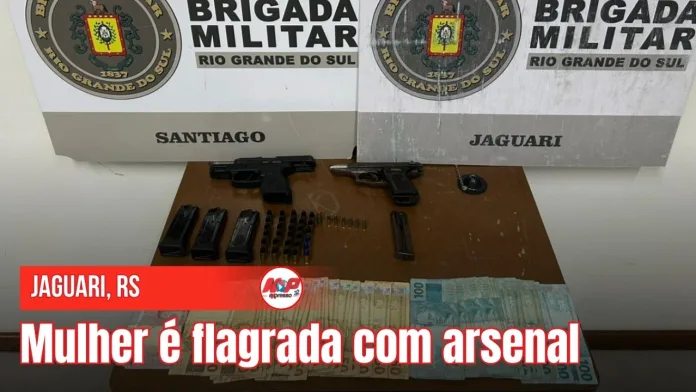Jaguari, RS – Após denúncia sobre possível armazenamento de armas, a Brigada prendeu uma mulher de 35 anos, a qual estava de posse de duas pistolas (calibres 22 e 9mm), munições, carregadores da arma 9mm e 3.459,00 em dinheiro. Ela foi encaminhada ao hospital e, posteriormente, à delegacia para o registro da ocorrência.