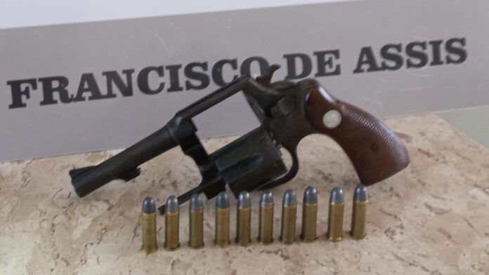 Os brigadianos foram avisados que um vovozinho estaria armado no centro. Ele foi localizado e abordado. A denúncia se confirmou e os policiais encontraram em sua cintura um revólver calibre 38 “engasgado de bala”.