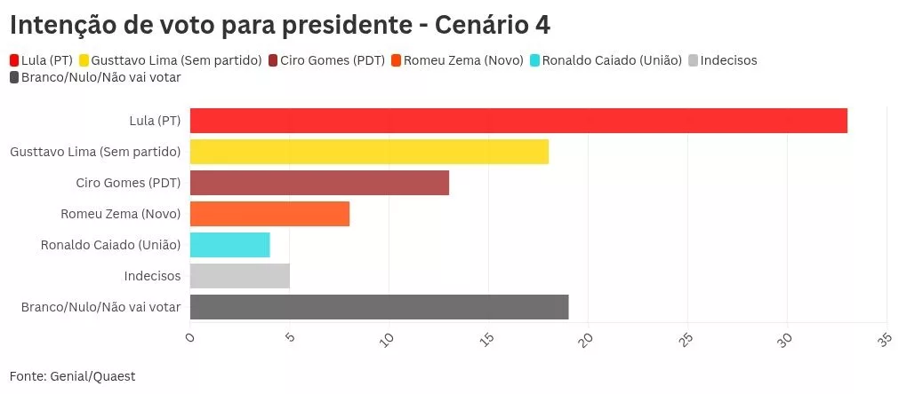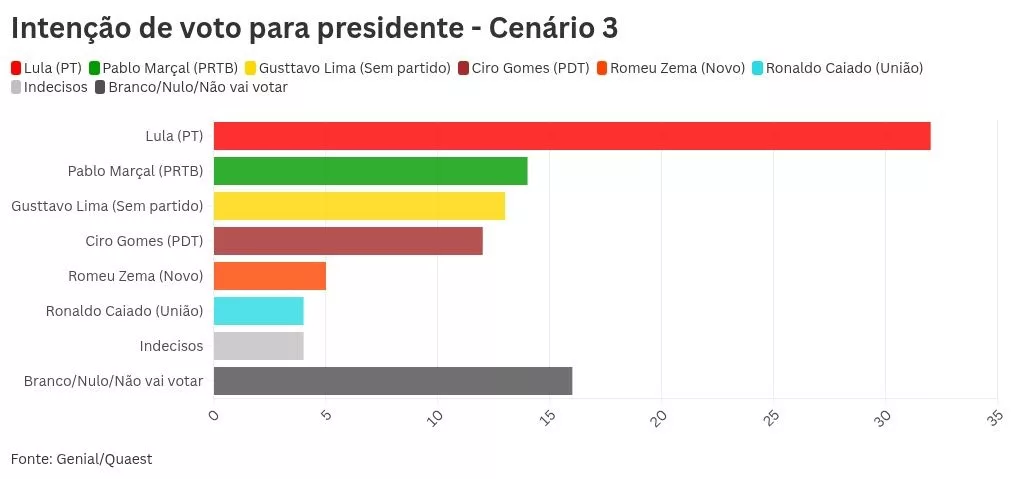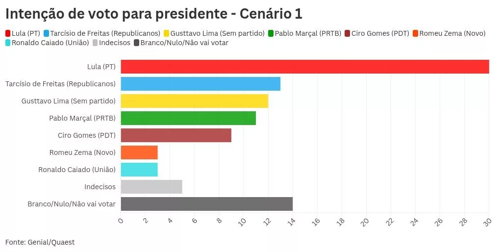 A pesquisa Genial/Quaest aponta Luiz Inácio Lula da Silva à frente de Tarcísio de Freitas, Gusttavo Lima e Pablo Marçal na disputa presidencial. No primeiro turno, Lula teria 30%, seguido por Tarcísio com 13%, Gusttavo Lima com 12% e Marçal com 11%. Ciro Gomes registraria 9%, enquanto Romeu Zema e Ronaldo Caiado alcançariam 3% cada. Indecisos somam 5%, e votos brancos, nulos ou abstenções chegam a 14%.