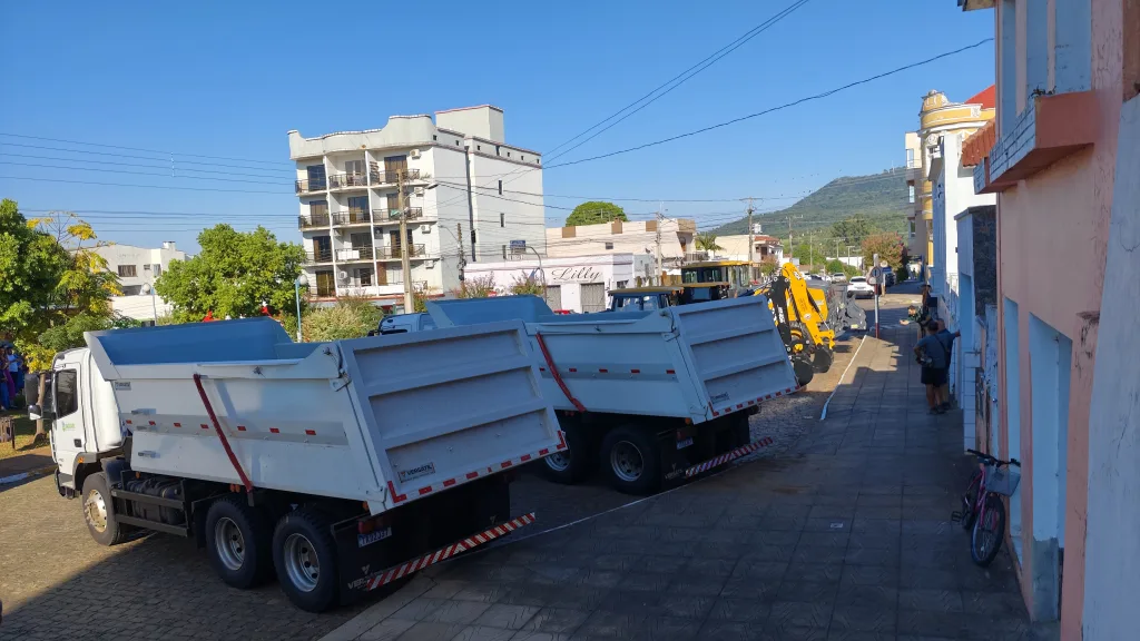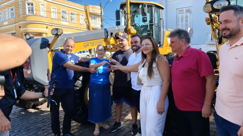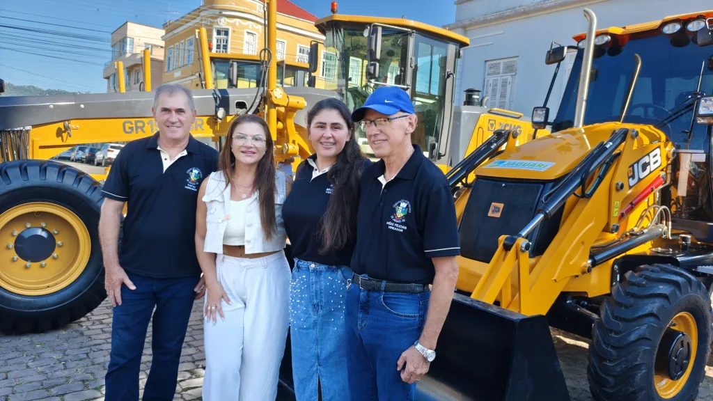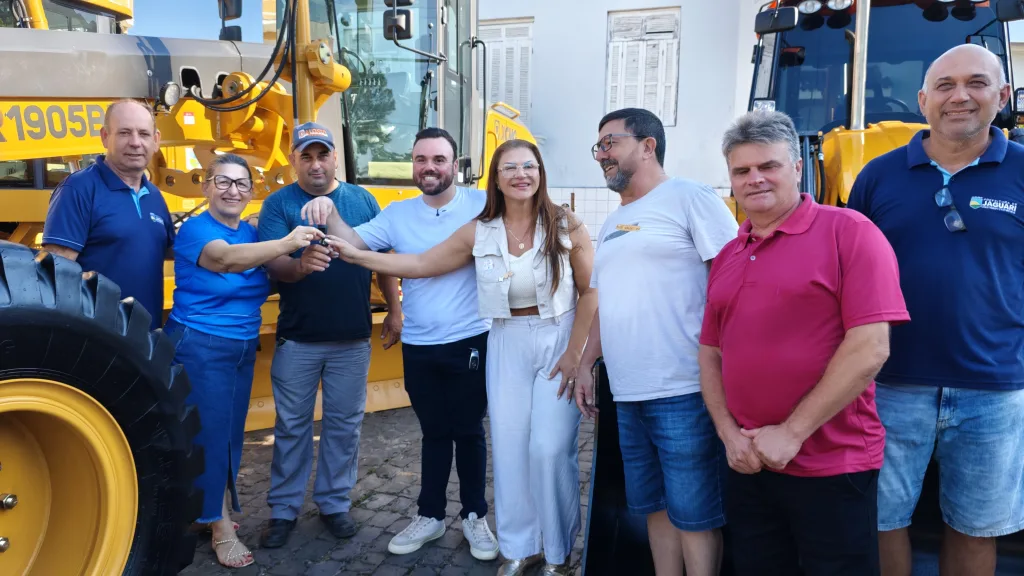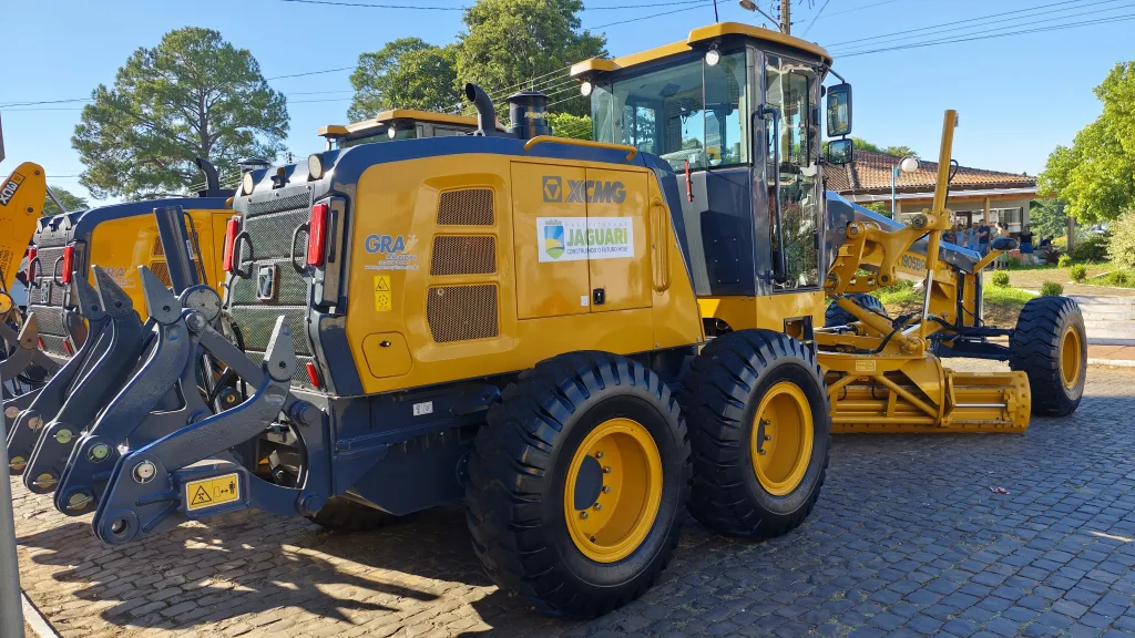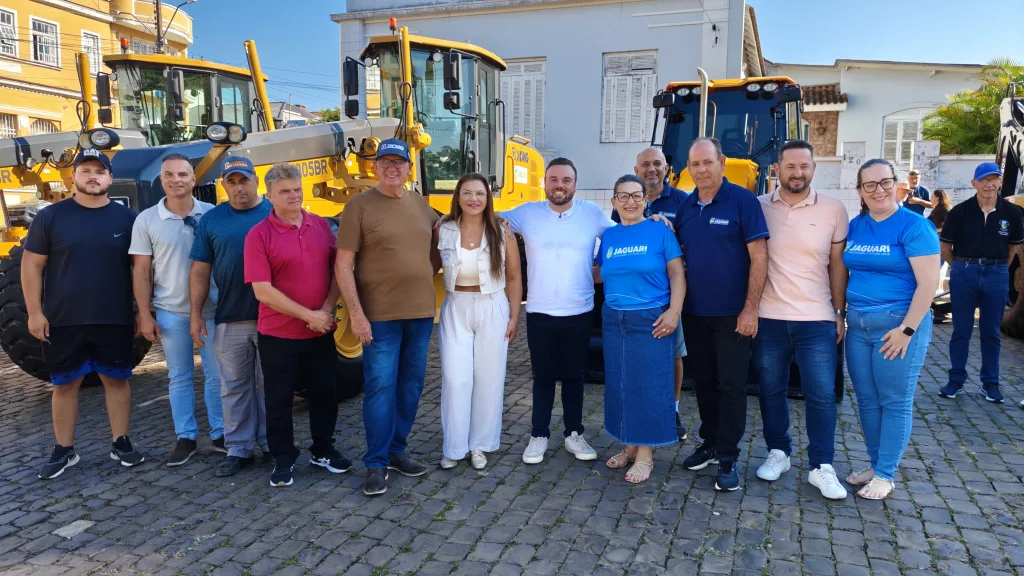 Jaguari – RS – (Região de Santiago) – O sábado começou com um fato histórico para o município e para quem vive no campo. O prefeito Igor Tambara e a vice Elenice Cattelan entregaram uma frota nova de retroescavadeiras, motoniveladoras e caminhões, somando um investimento que chega perto dos 4 milhões. A praça ficou lotada para o ato que garante mais fôlego para as obras e, principalmente, para a manutenção das estradas do interior.