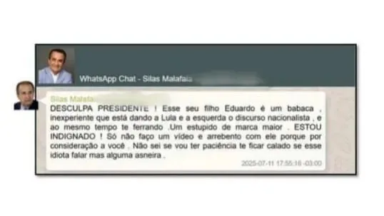 Em áudio enviado a Bolsonaro, Malafaia chamou Eduardo de “babaca” e disse que ele estava dando munição para Lula e para a esquerda. “Um estúpido de marca maior, estou indignado. Só não faço um vídeo e arrebento com ele porque por consideração a você”, afirmou o religioso.