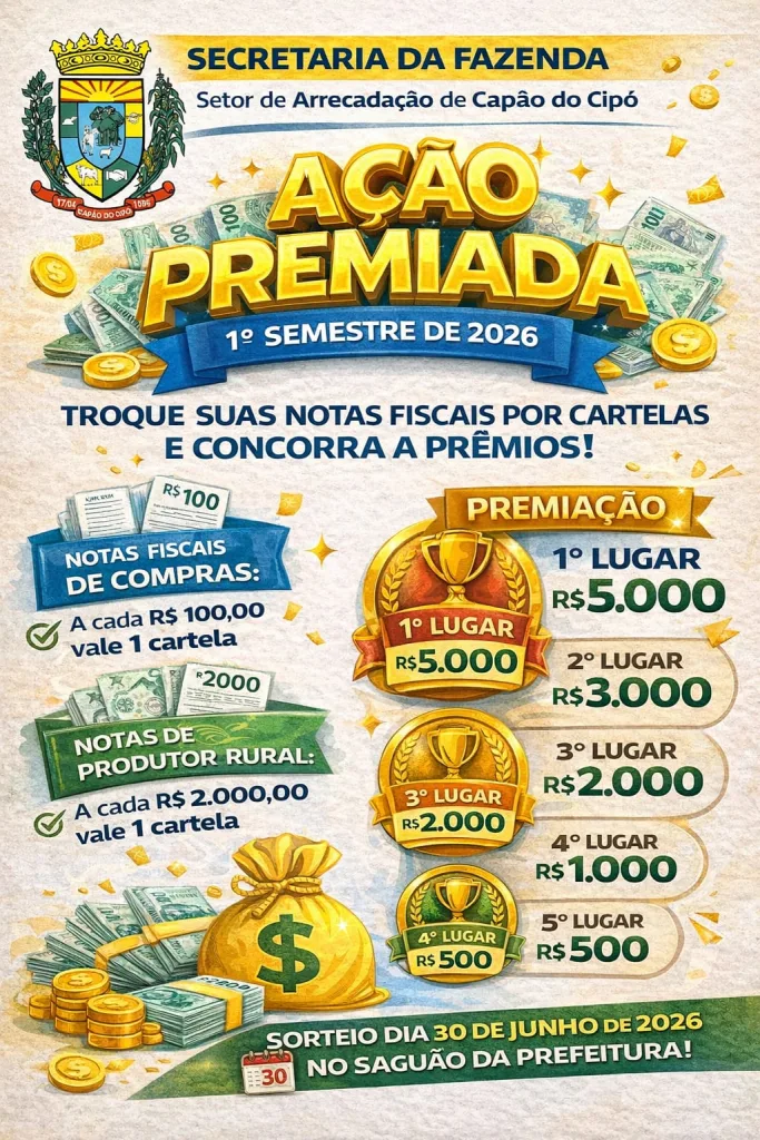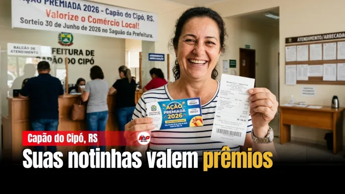 Capão do Cipó, RS – A prefeitura de Capão do Cipó lançou a Ação Premiada 2026 para movimentar o comércio e incentivar a emissão de notas fiscais. A campanha foi criada por decreto municipal e convida todos os moradores para participar.