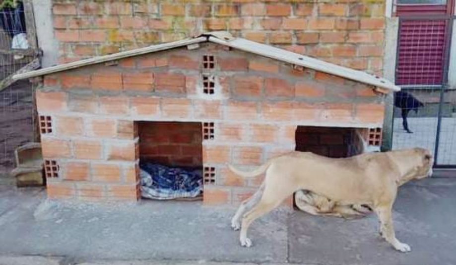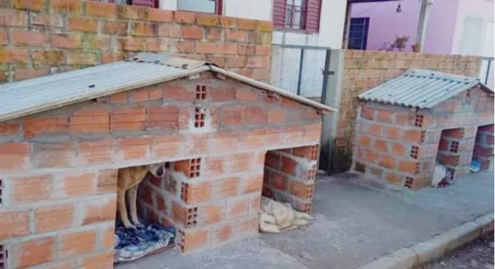 Preocupada com o frio e as chuvas, uma moradora da rua das Hortências, mandou construir casinhas na frente de sua casa para abrigar animais de rua.