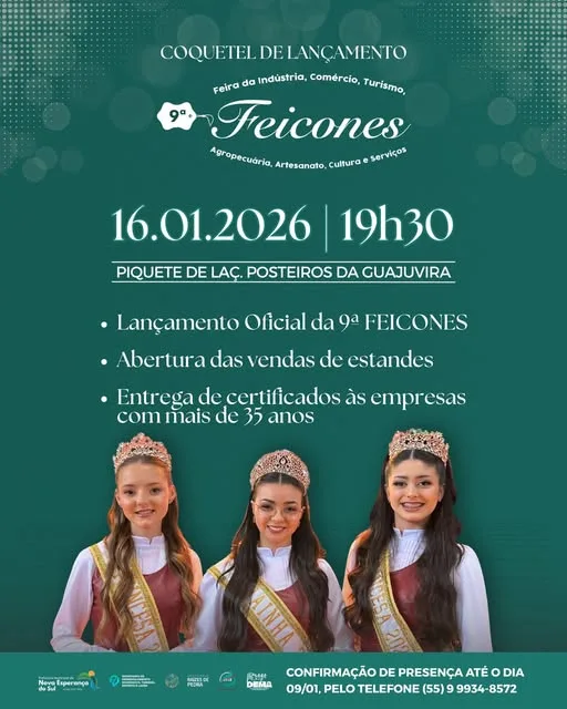 Nova Esperança – A Administração Municipal de Nova Esperança do Sul convida toda a comunidade para o coquetel de lançamento da 9ª FEICONES – Feira da Indústria, Comércio, Turismo, Agropecuária, Artesanato, Cultura e Serviços.