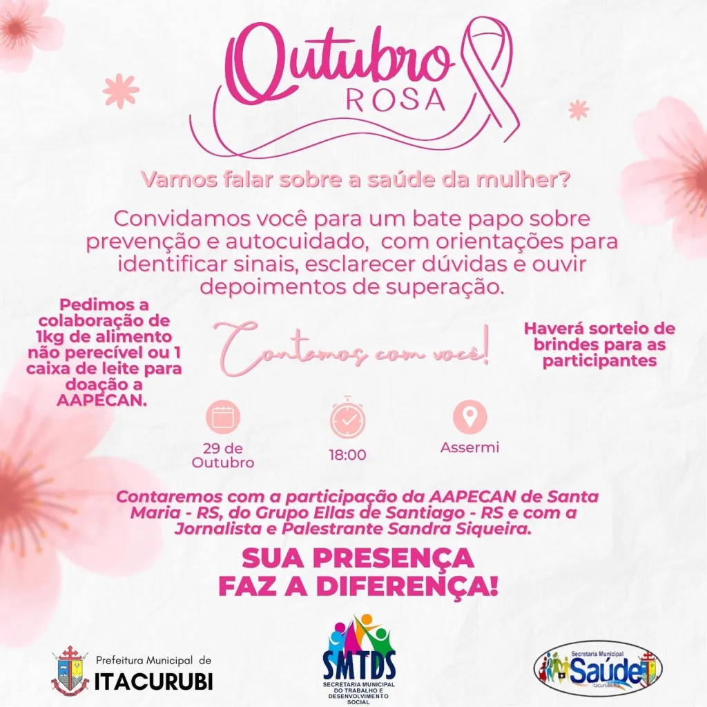 Itacurubi, RS – Em alusão à campanha Outubro Rosa, a Prefeitura de Itacurubi, por meio da Secretaria de Saúde e da Secretaria de Trabalho e Desenvolvimento Social, promove um evento especial dedicado à saúde da mulher, reforçando a importância da prevenção ao câncer de mama e do autocuidado.