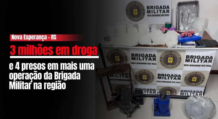 Nova Esperança do Sul – RS – (Região de Santiago) – Quatro sujeitos acabaram presos neste domingo (22) durante uma investida da Brigada Militar que descobriu um laboratório do tráfico. O grupo usava o sossego da cidade pequena para preparar e distribuir drogas para os municípios vizinhos. A batida aconteceu em uma casa na rua Redênzio Frizzo, bem perto do ambulatório, onde a movimentação já era monitorada pelos policiais do 45º Batalhão.