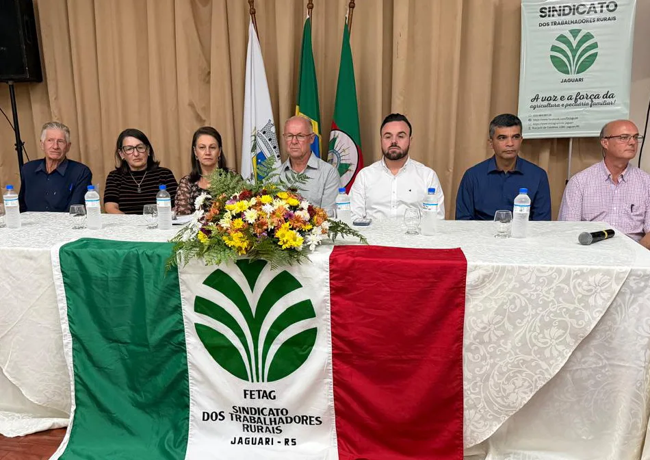 Jaguari – RS – (Região de Santiago) – O Clube Sete de Setembro ficou lotado na noite de 17 de abril para a posse da nova diretoria e do conselho fiscal do Sindicato dos Trabalhadores Rurais. O evento reuniu muita gente importante, desde lideranças da Fetag até as famílias do campo, para celebrar o começo de um novo ciclo que vai até 2030. Gilberto Antônio Bolzan foi reconduzido ao cargo de presidente e prometeu continuar firme na defesa de quem tira o sustento da terra.