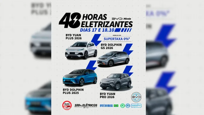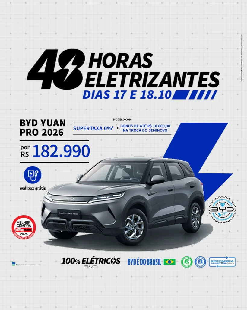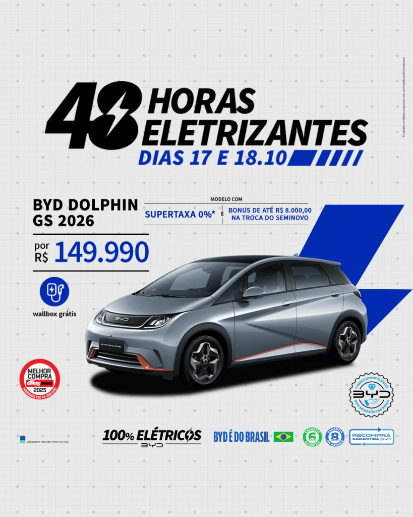 Santiago, RS – Chegou a hora de dirigir o futuro! Nos dias 17 e 18 de outubro, aproveite condições imperdíveis para garantir o seu BYD 100% elétrico com supertaxa 0%, wallbox grátis e bônus incrível na troca do seu seminovo!