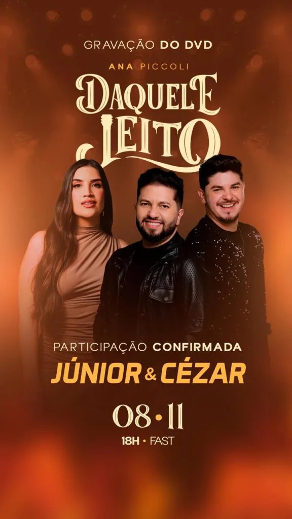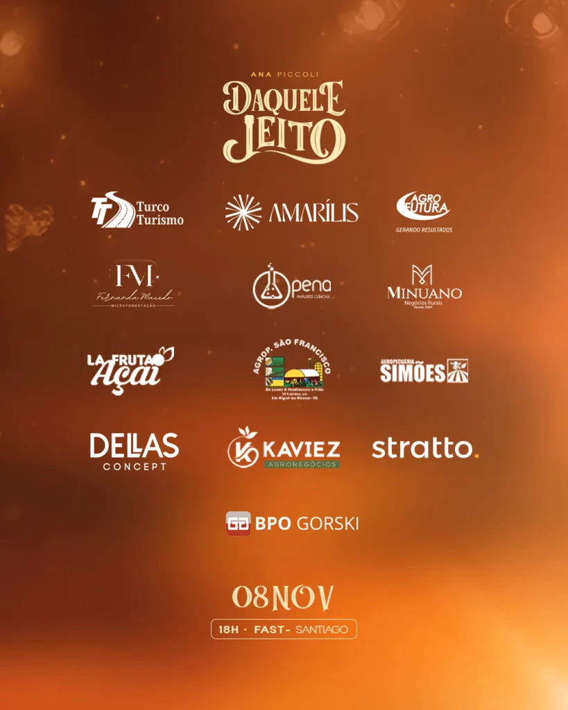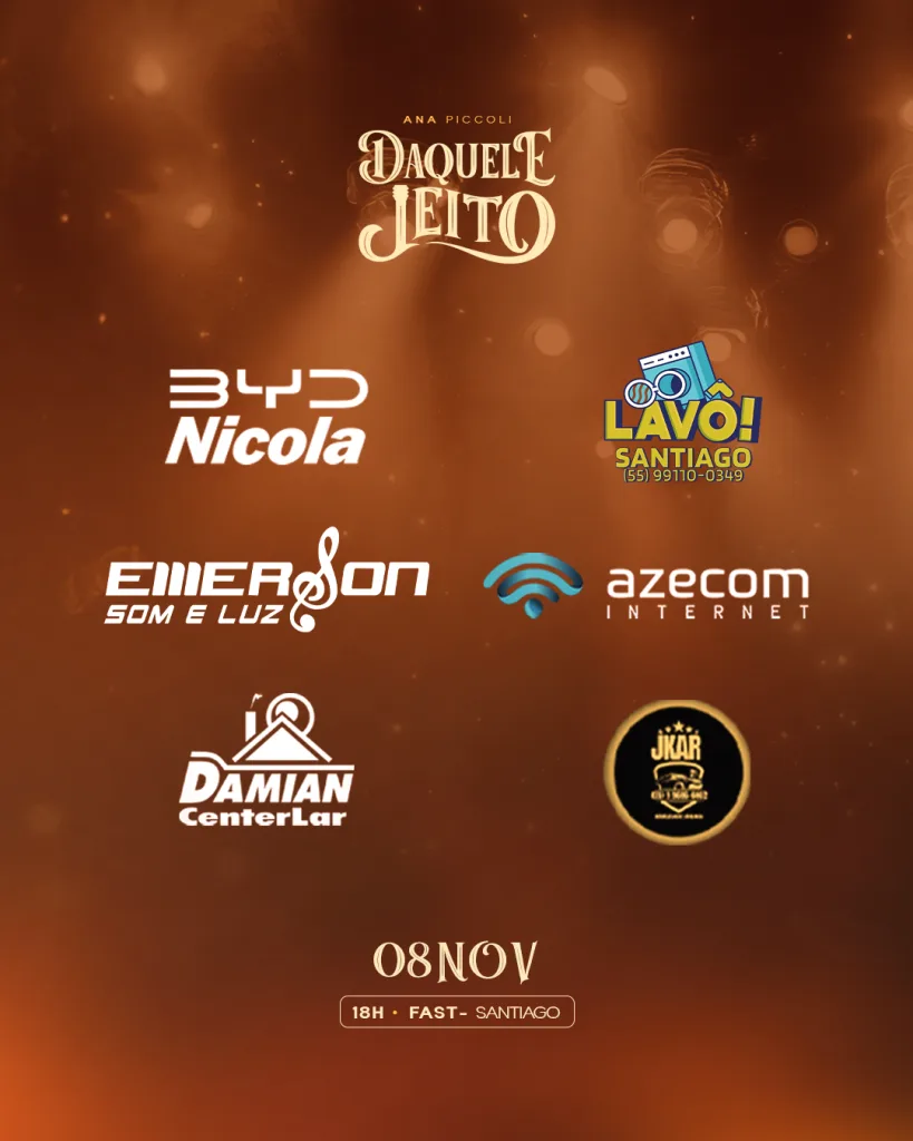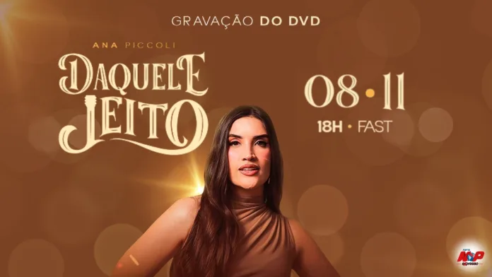 Santiago, RS – A cantora santiaguense, Ana Piccoli, vai gravar o seu novo DVD “Daquele Jeito” no dia 8 de novembro (sábado), a partir das 18h, no Fast Meet. O evento será aberto ao público, com venda de ingressos, e promete uma noite cheia de emoção e boa música. Para participar da gravação, acesse este link: clique aqui.