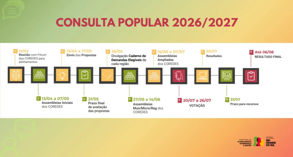 Santiago e região – O Corede Vale do Jaguari dá início à organização da Consulta Popular 2026/27 com uma assembleia nesta quinta, às 9h, no Salão de Atos da URI. O encontro reúne lideranças e representantes dos municípios da região.