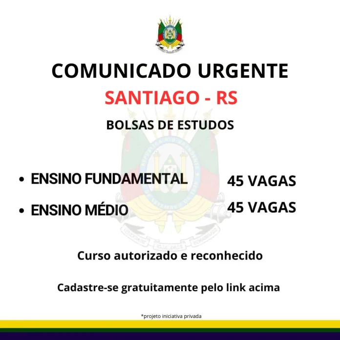 Santiago, RS – Abertas as inscrições para bolsas de estudos para conclusão de ensino fundamental e médio.