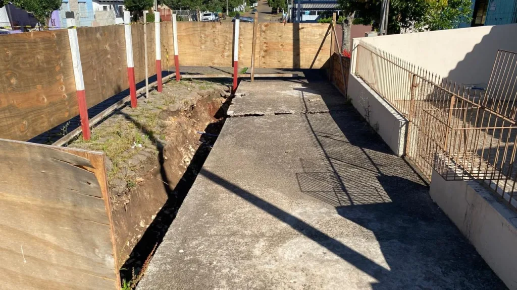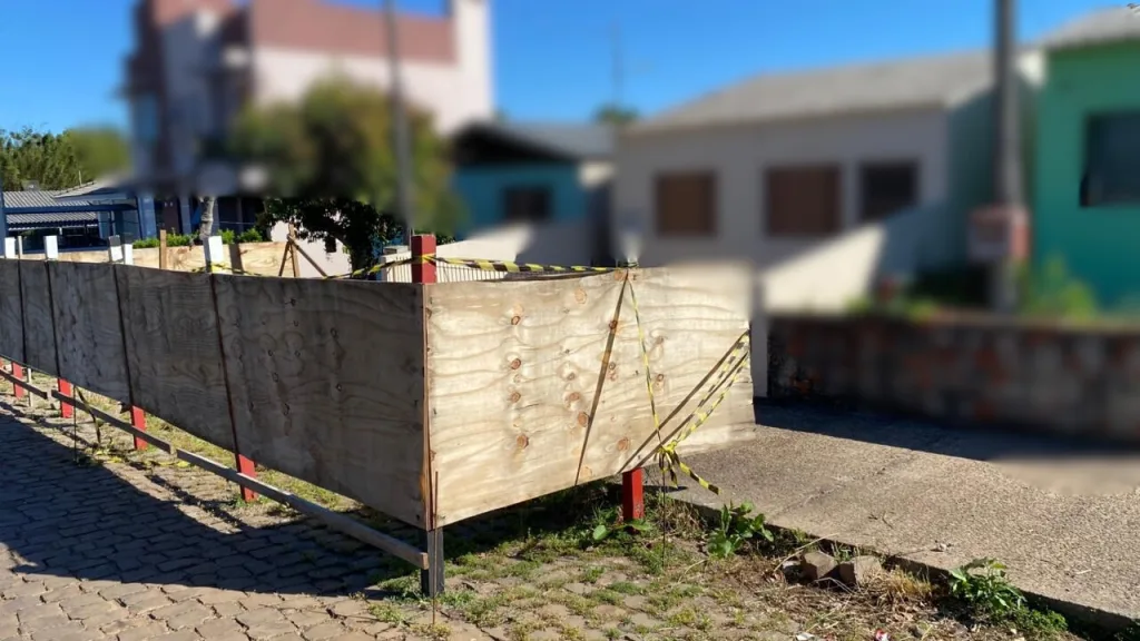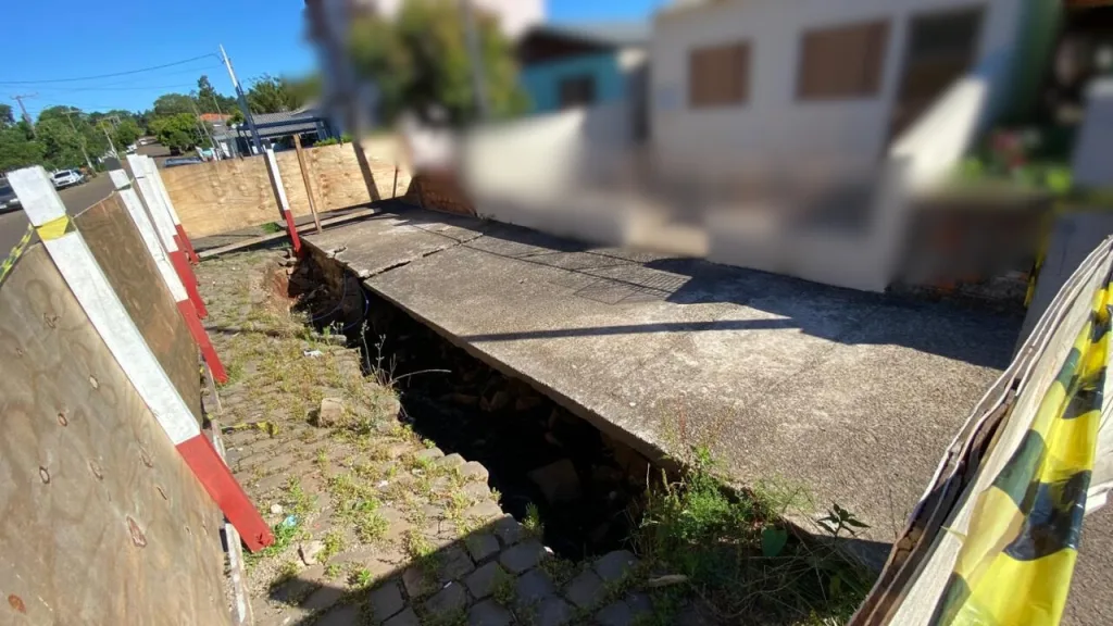A frente de uma das residências já foi isolada com tapume, e o buraco começa a atingir a casa ao lado. A situação é crítica e expõe os moradores ao perigo, já que o acesso às casas está comprometido e há esgoto passando pelo local.