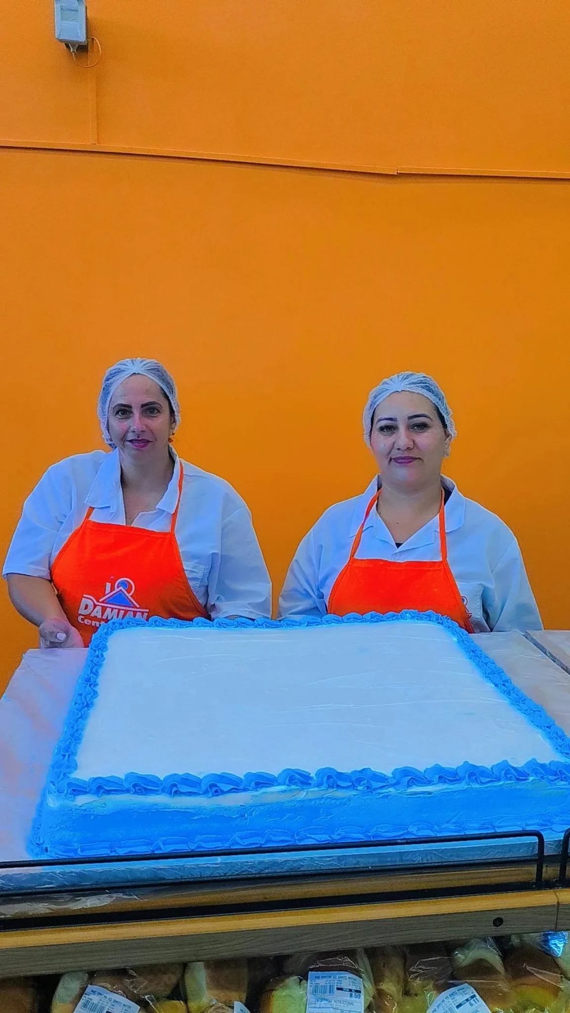 Para a festa deste sábado (3), foram produzidos 180kg de torta, recheados com uma combinação de coco, doce de leite, nata e abacaxi. Decorado nas cores da bandeira santiaguense (azul, amarela e vermelha), o bolo é o símbolo da gratidão da equipe Damian em participar deste momento histórico.
