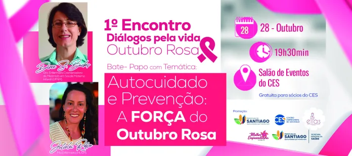 Santiago, RS – O 1º Encontro “Diálogos pela Vida”, com o tema Autocuidado e Prevenção: a força do Outubro Rosa, ocorrerá no dia 28 de outubro de 2025, às 19h, no Centro Empresarial. O evento busca incentivar a conscientização sobre a saúde da mulher e a importância da prevenção ao câncer de mama.