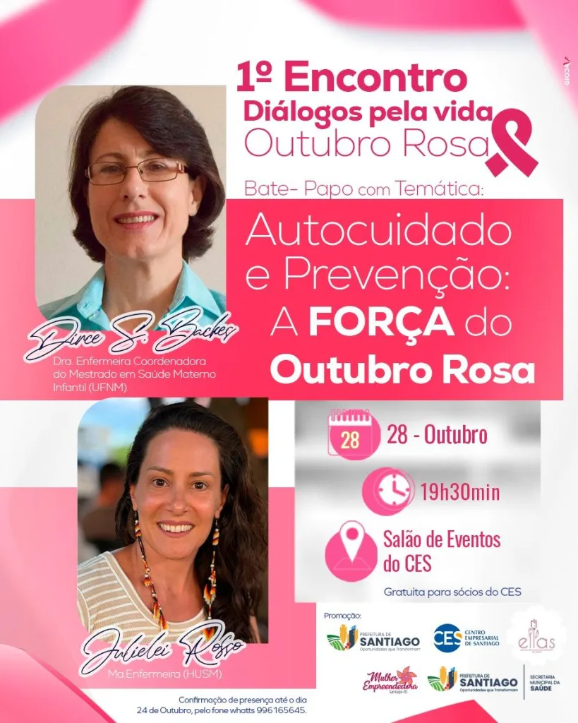Santiago, RS – O 1º Encontro “Diálogos pela Vida”, com o tema Autocuidado e Prevenção: a força do Outubro Rosa, ocorrerá no dia 28 de outubro de 2025, às 19h, no Centro Empresarial. O evento busca incentivar a conscientização sobre a saúde da mulher e a importância da prevenção ao câncer de mama.