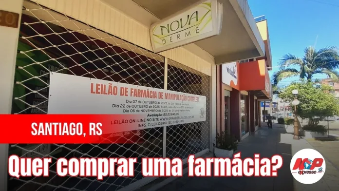 Santiago, RS – Fechada há meses sem aviso prévio, a Farmácia de Manipulação Nova Derme (na Rua dos Poetas) anunciou que irá a leilão online no próximo dia 6 de novembro para a melhor oferta. A farmácia completa está avaliada em R$ 23.645,00.