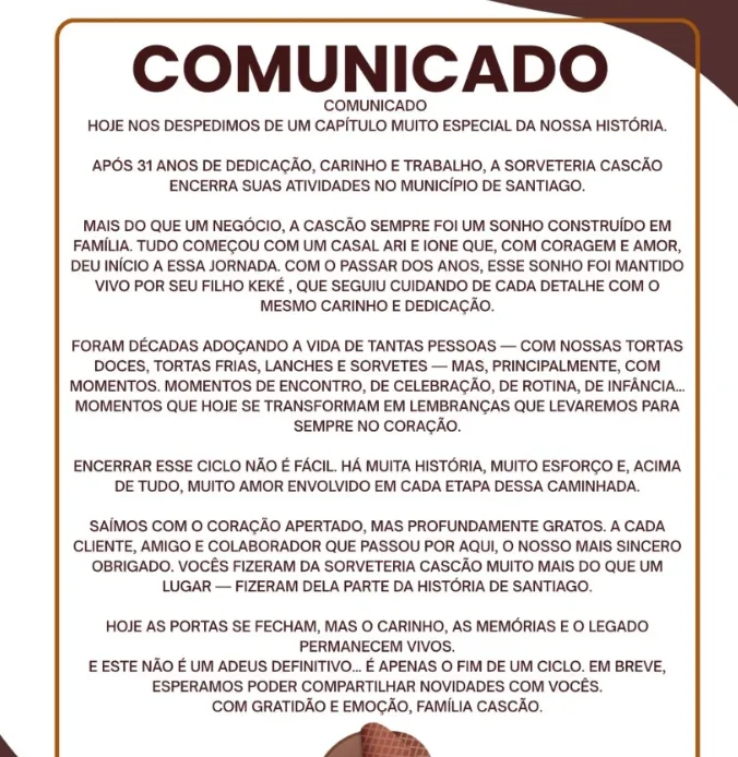 Santiago – RS – O fim deste domingo de Páscoa trouxe uma surpresa para a comunidade. A tradicional sorveteria Cascão anunciou o encerramento das atividades após mais de 30 anos de história. O local, em frente ao restaurante Casa Velha, era ponto certo de encontro para famílias e amigos.