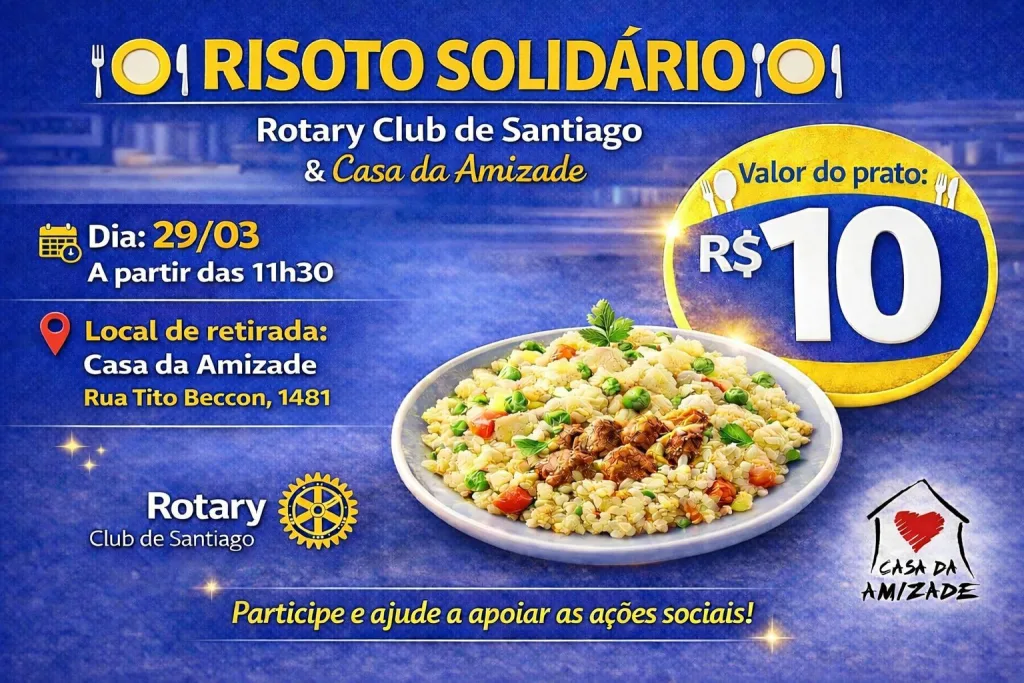 Santiago, RS – Quem quer garantir o risoto de domingo já pode se programar. O Rotary Club Santiago, junto da Casa da Amizade, prepara mais uma edição do risoto solidário no próximo domingo (29).