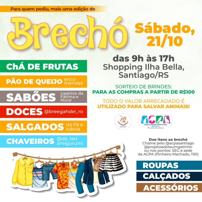 A Associação de Conservação e Proteção aos Animais (ACPA) e o Projeto Adote um Gatinho convidam para novo brechó sábado (21), das 9h às 17h, no shopping Ilha Bella.