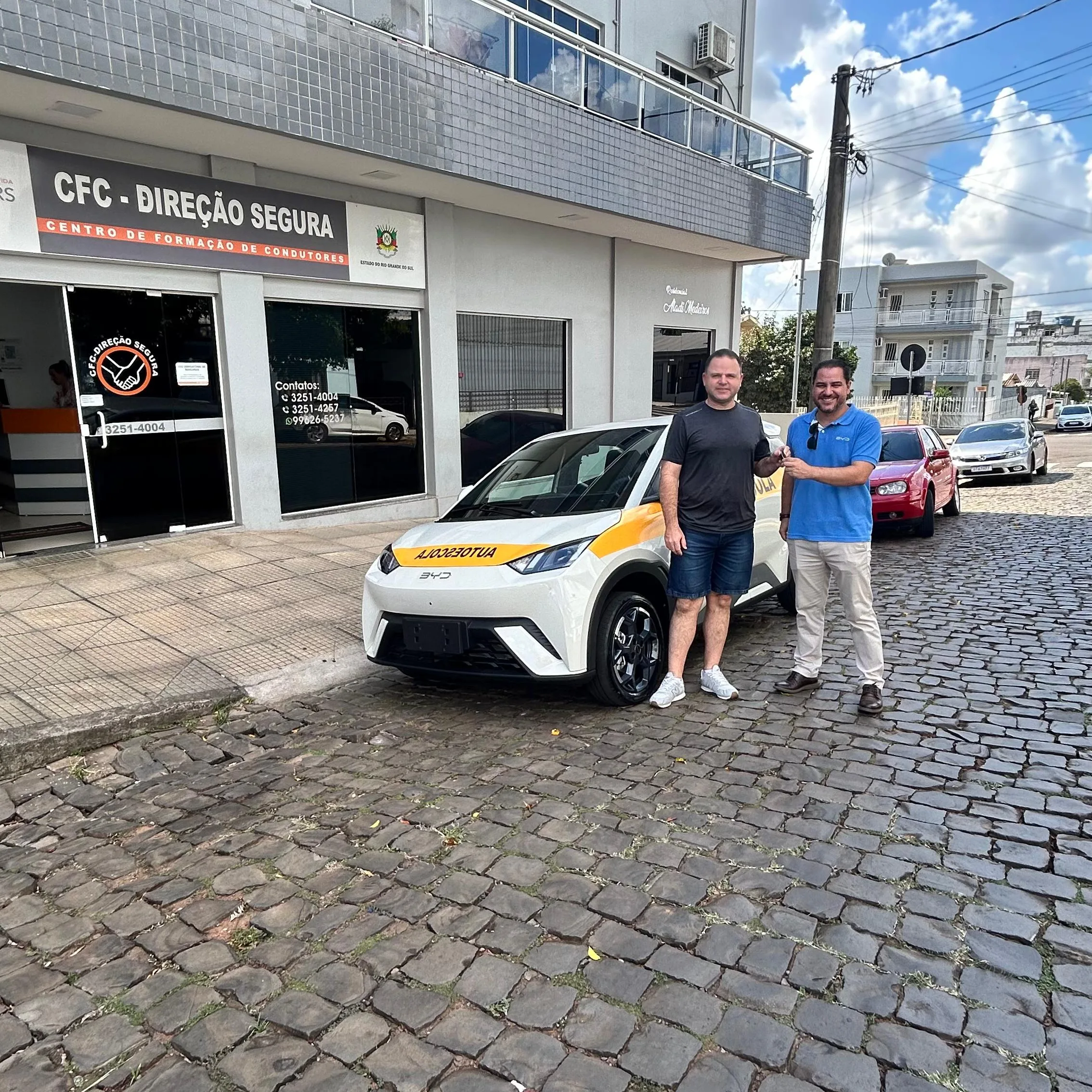 Santiago, RS – Patrick Garcia, gerente da Nicola BYD, fez a entrega de um carro 100% elétrico para o diretor do CFC Direção Segura, Thiago Medeiros. O modelo é um BYD Dolphin Mini, automático, voltado para uso em aulas de direção.