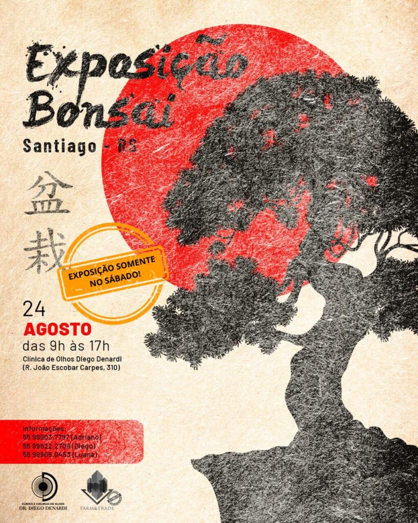 Organizado pelo médico Diego Denardi, que há poco foi ao Japão, o evento contará com uma exposição de bonsai e um curso intensivo sobre essa técnica fascinante. O evento acontecerá na clínica do Dr. Denardi, em parceria com o Clube de Bonsai de Santiago.