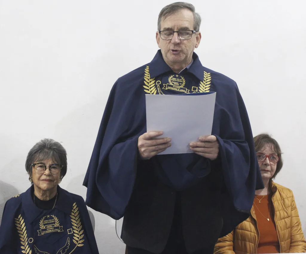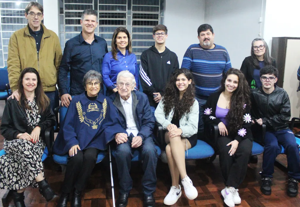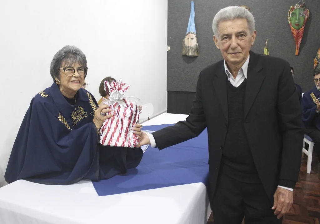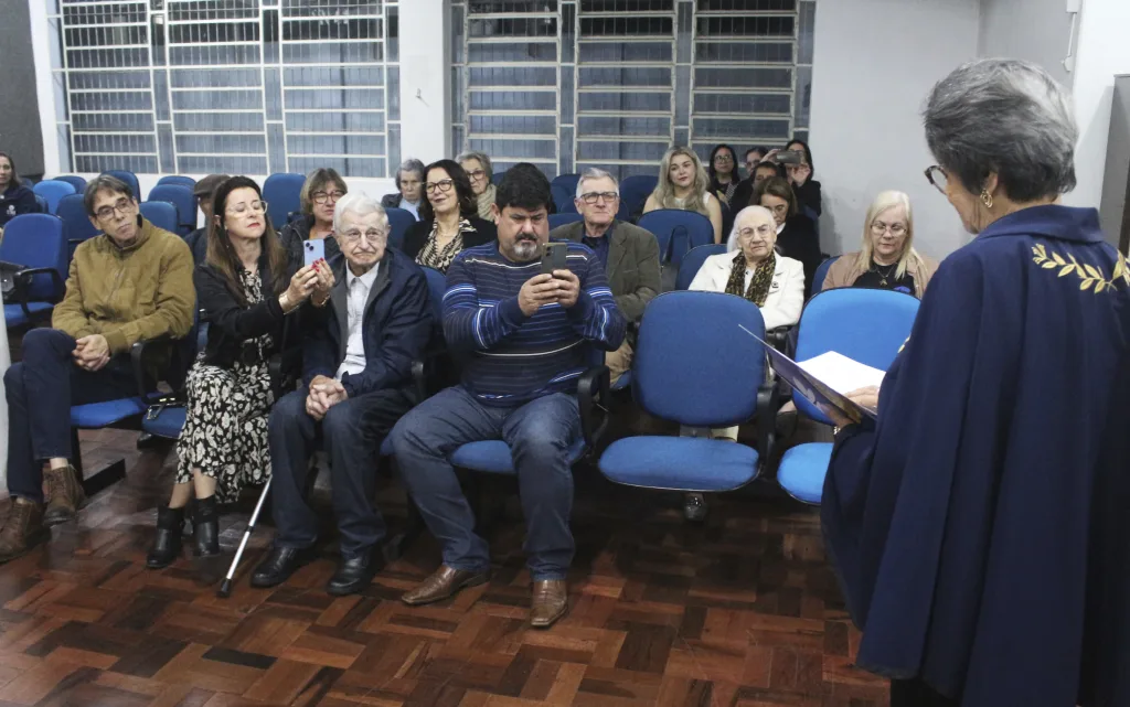 Aos 86 anos, a professora Enadir Vielmo é uma figura proeminente na cultura local, sucedendo o escritor Airton Gazzana na liderança da da entidade. O evento reuniu membros da Academia, autoridades e familiares para celebrar a nova gestão (2025/2027).