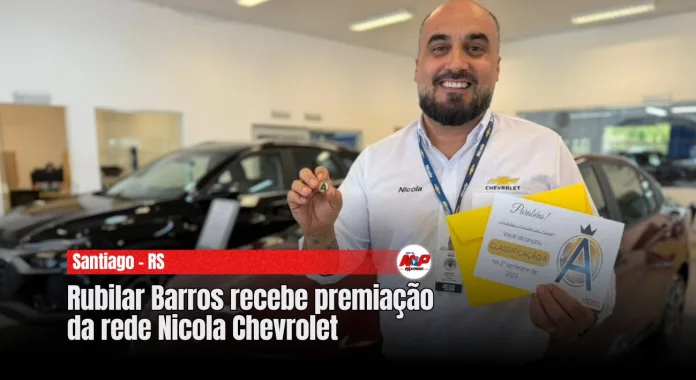 Santiago – RS – Rubilar Barros foi homenageado com a premiação Classificação A, concedida pela rede Nicola Chevrolet pelo desempenho de excelência alcançado no segundo semestre de 2025. Atuando há vários anos no grupo, Rubilar está atualmente à frente da agência de Santiago, onde tem se destacado pelo profissionalismo, dedicação e forte ligação com a comunidade local.