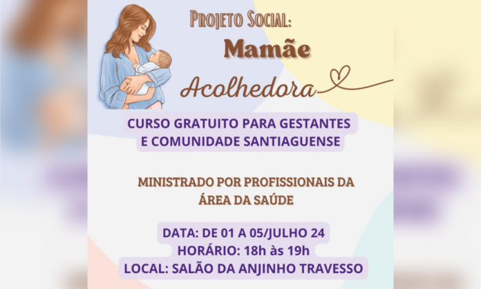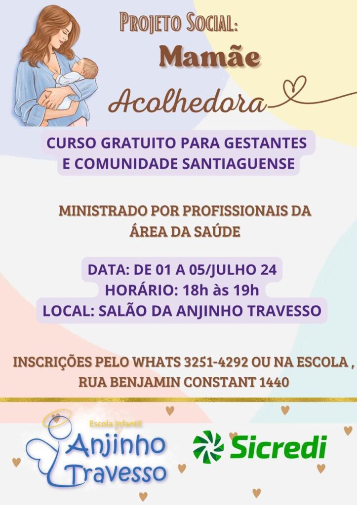 Santiago – Na próxima semana, de 01 a 05 de julho, das 18h às 19h, acontecerá o Projeto Social Mamãe Acolhedora. O evento será realizado no salão da escola Anjinho Travesso.